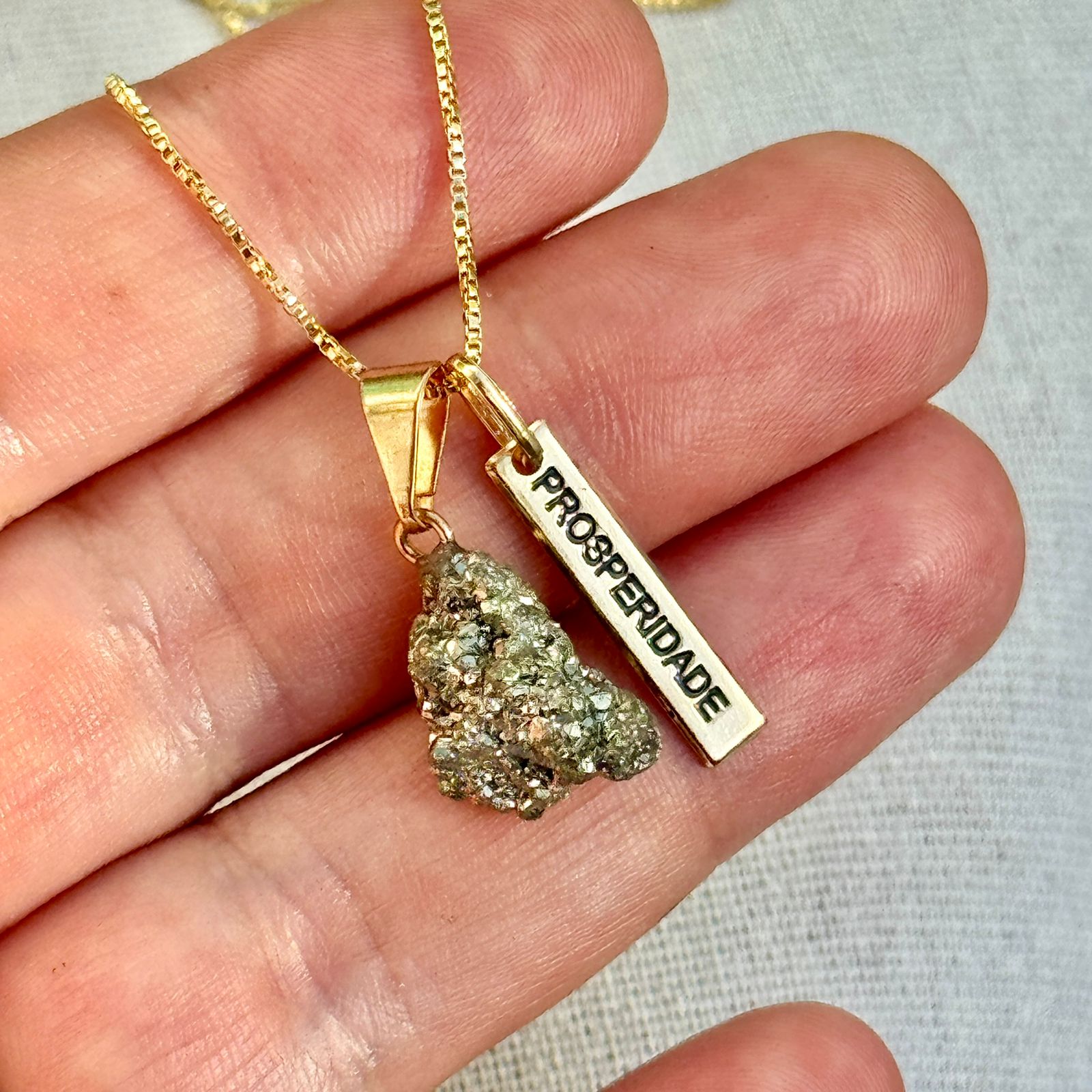 O Colar da Prosperidade foi criado para quem deseja atrair abundância, oportunidades e vibrações de crescimento para o dia a dia. Ele combina dois elementos poderosos: o pingente mini de Pirita natural e uma plaquinha metálica escrita “Prosperidade”, ambos banhados a ouro, formando um amuleto elegante, energético e intencionado.