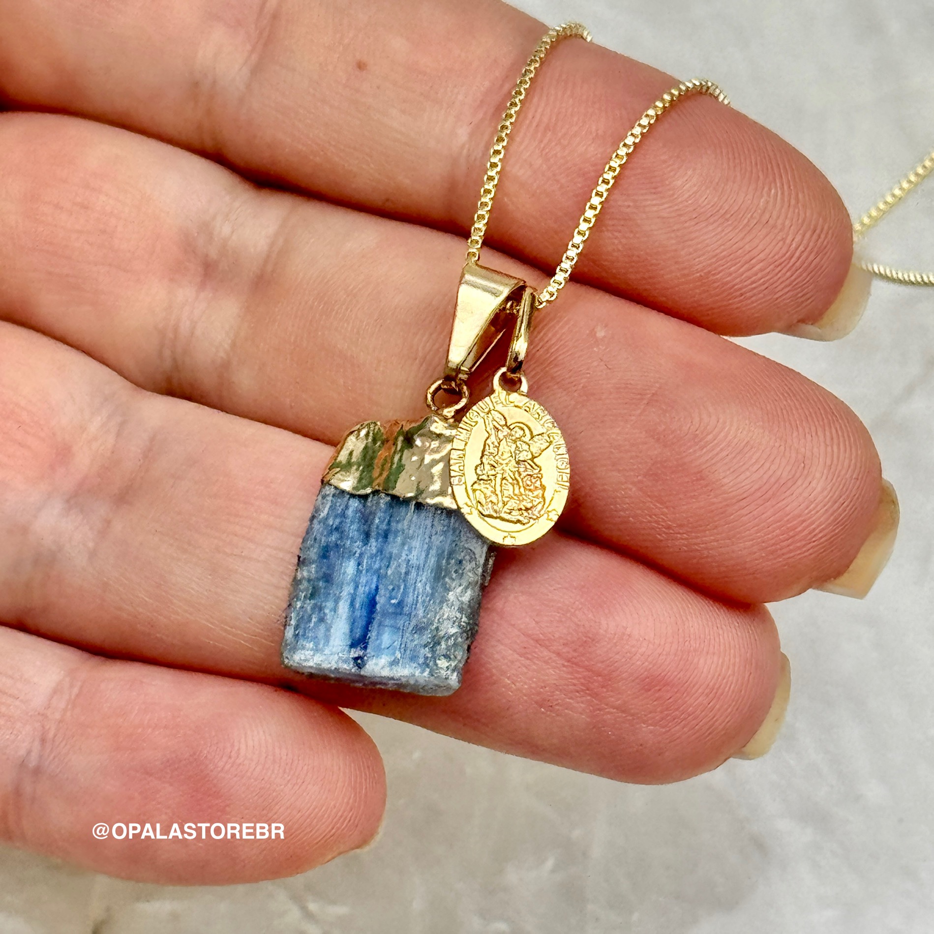 Colar São Miguel Arcanjo com Cianita Azul Natural – Banhado em Ouro