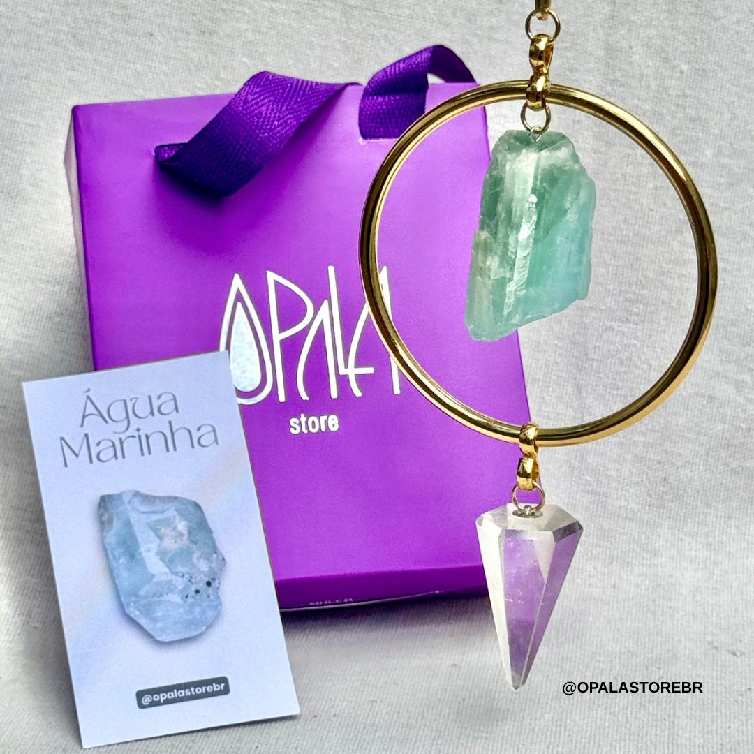 Feito com Água-Marinha natural e um pêndulo de Quartzo Translúcido, o pendente atua equilibrando emoções, promovendo clareza e ajudando a sustentar a energia necessária para iniciar 2026 com presença e propósito. A estrutura em alumínio foi desenhada dentro da estética minimalista e mística da Opala, unindo beleza, intenção e espiritualidade acessível.