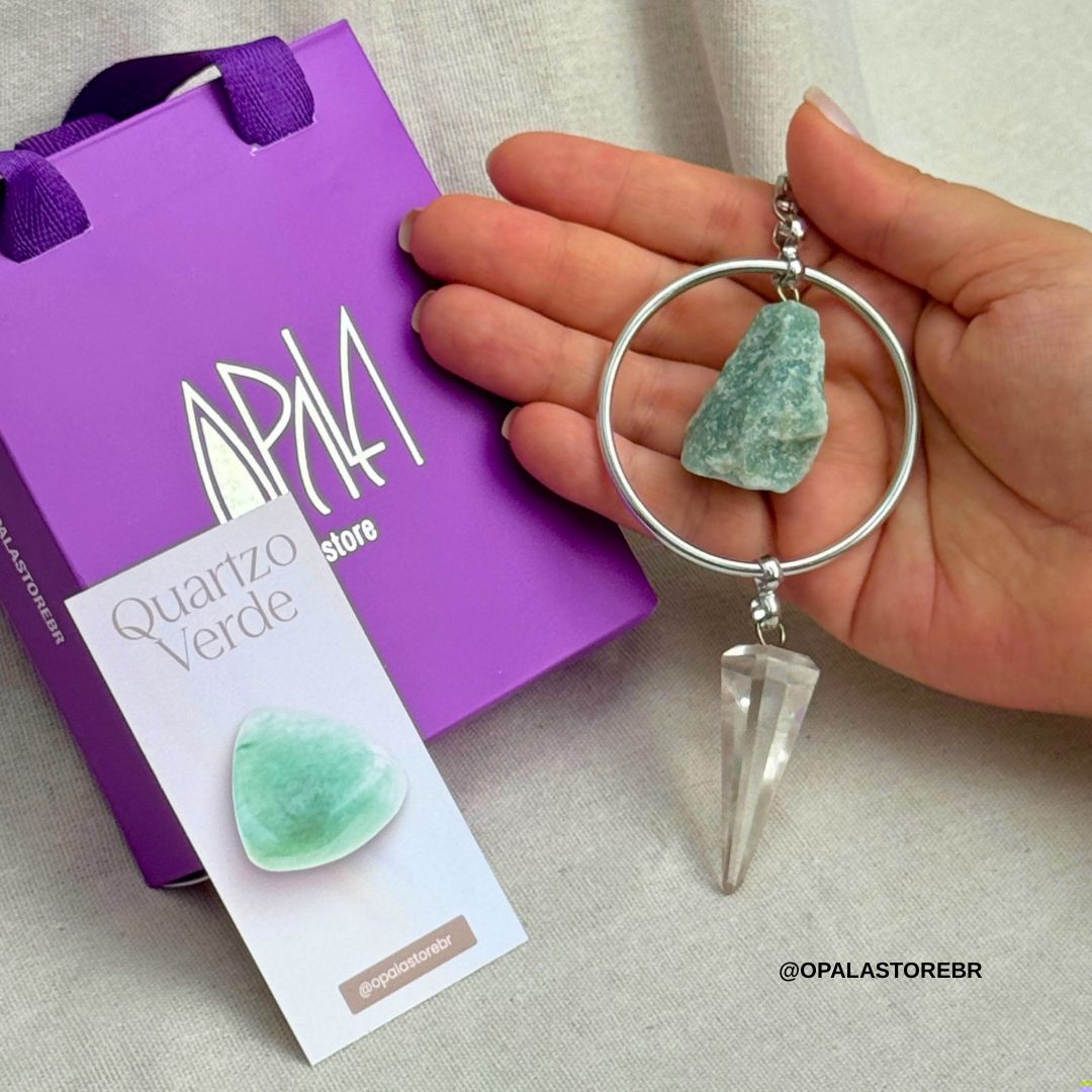 Produzido com Quartzo Verde bruto e um pêndulo de quartzo translúcido, este pendente favorece a cura energética, atrai boa sorte e renova o fluxo da casa. Segundo princípios do Feng Shui, o Quartzo Verde harmoniza ambientes e restaura a energia vital, funcionando muito bem até no banheiro, onde a energia costuma se dispersar. A estrutura em alumínio, dourado ou prateado, possui design exclusivo da Opala, garantindo leveza, durabilidade e beleza.