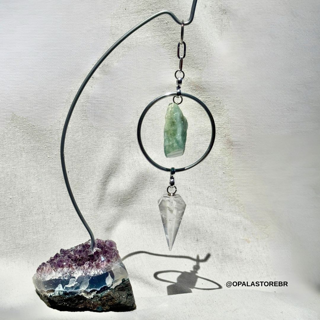 A estrutura em alumínio prateado com haste metálica cria uma peça sofisticada que une decoração, espiritualidade e intenção energética, perfeita para ambientes de meditação, escritórios, salas de estar ou qualquer espaço que mereça energia elevada e beleza natural.
