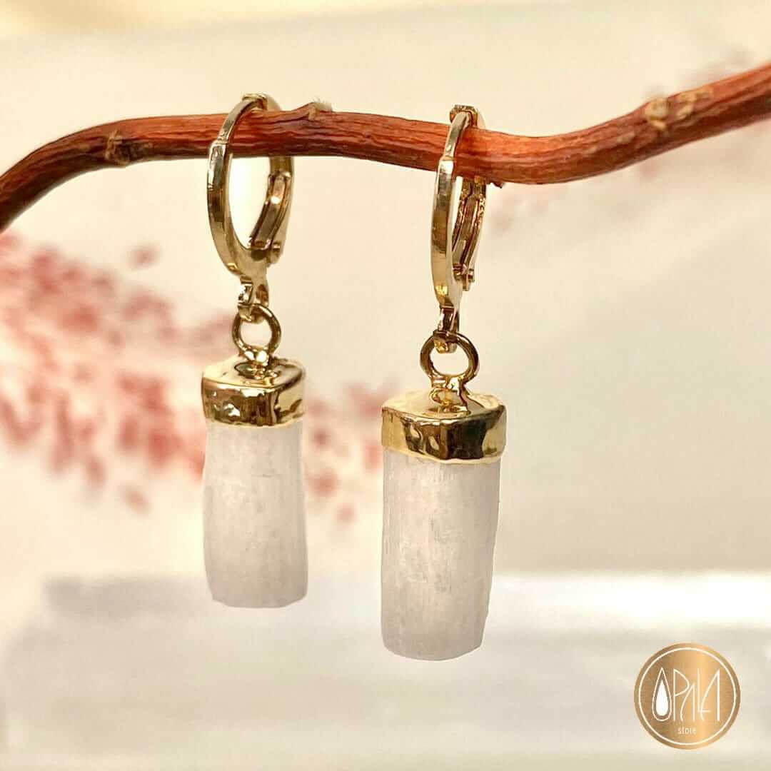 Brinco de Selenita Dourado – Uma joia de luz que eleva sua energia e conecta você à pureza do Universo.